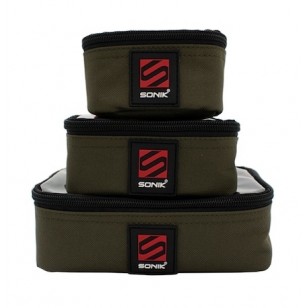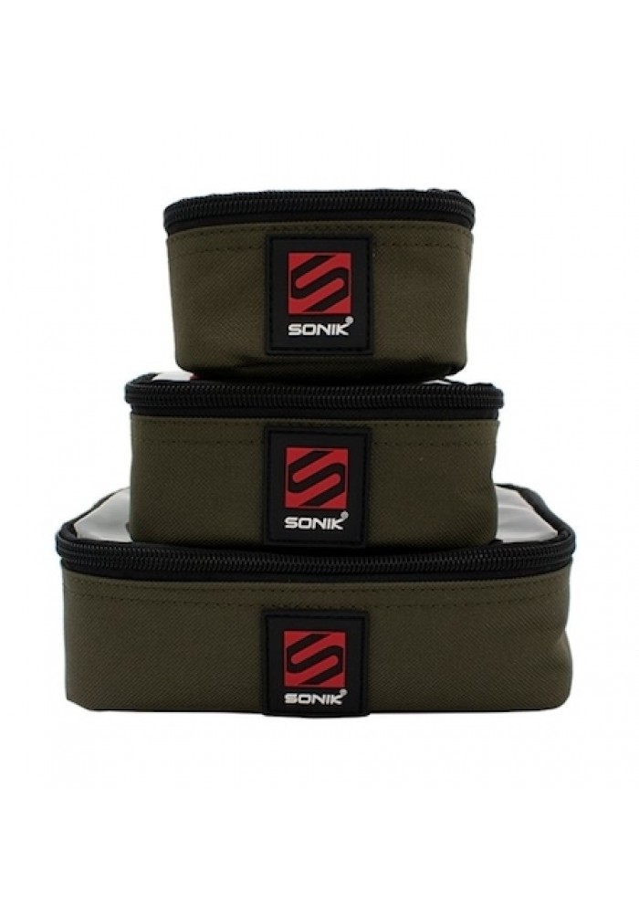 Set di tre utili buste per accessori con coperchi trasparenti per una rapida identificazione del contenuto. Perfetto per tutti i tipi di accessori per la pesca. Tessuto 600D resistente e resistente all'acqua.