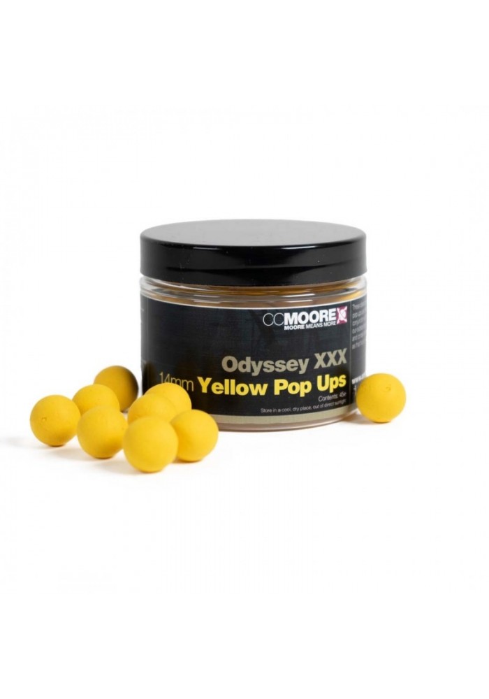 Pop-ups gialle ultra visibili in acqua della linea odyssey xxx, quindi gusto cozza, estremamente galleggianti anche oltre 24 ore, di diametro 13-14 mm, progettate per qualsiasi presentazione. Caratterizzate da una consistenza ideale per essere usate con qualsiasi booster liquid o booster spray.