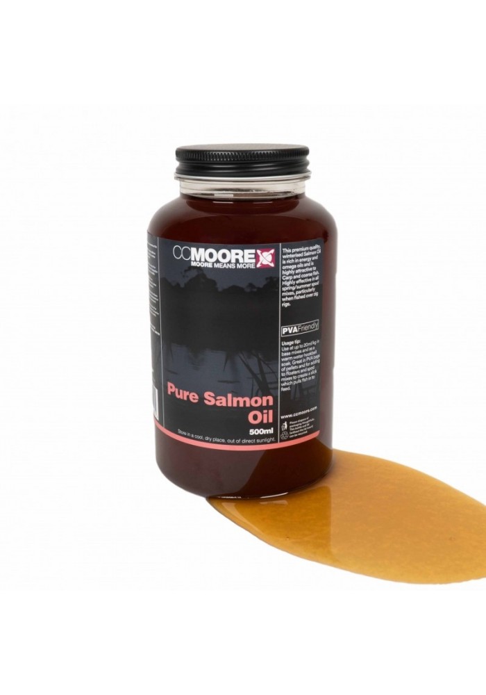 Oltre ad essere un fornitore riconosciuto di Omega 3 e 6, l'olio di salmone è anche una fonte concentrata di energia con potenti proprietà antiossidanti e che donano all' esca un forte potere attirante oltre ad essere di notevole valore nutrizionale per i pesci. Essendo un olio non si scioglie i materiali in PVA ed è ideale per l'utilizzo all'interno stick mix mescola e PVA bag oltre ad essere una ottimo additivo a pellet, particles e Spod mix.