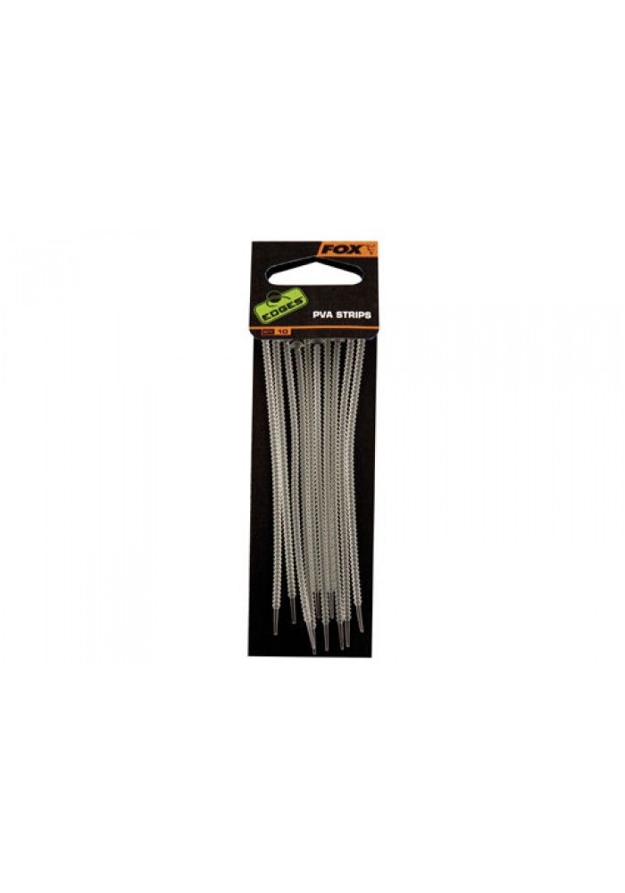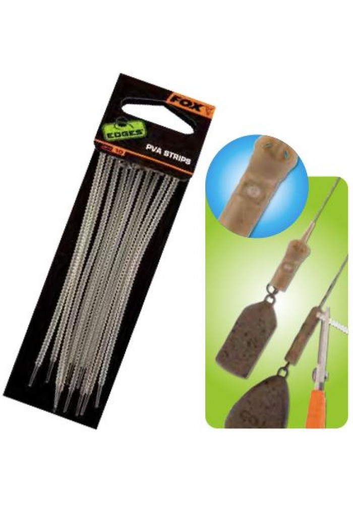 Le PVA Strips della Fox sono accessori idrosolubili per realizzare montature a elicottero con piombo a perdere. Queste piccole strip in PVA sono disegnate per un utilizzo con Chod / Heli Buffer Sleeve, Heli Buffer Sleeve e Angled Drop Off Run Rig Kit quando si vuole far sganciare il piombo. Per spiegarlo con parole più semplici, bloccano il piombo sulla clip da elicottero nel lancio, e si sciolgono una volta in acqua. Così facendo, quando il pesce abbocca, grazie alla semplice trazione delle fuga il piombo si stacca e non va più ostacolare il combattimento, penzolando a pochi centimetri dall'amo lungo la lenza. Il tempo di dissolvimento dipende dalla temperatura dell'acqua. In ogni confezione di FOX PVA Strips sono contenuti 10 pezzi.