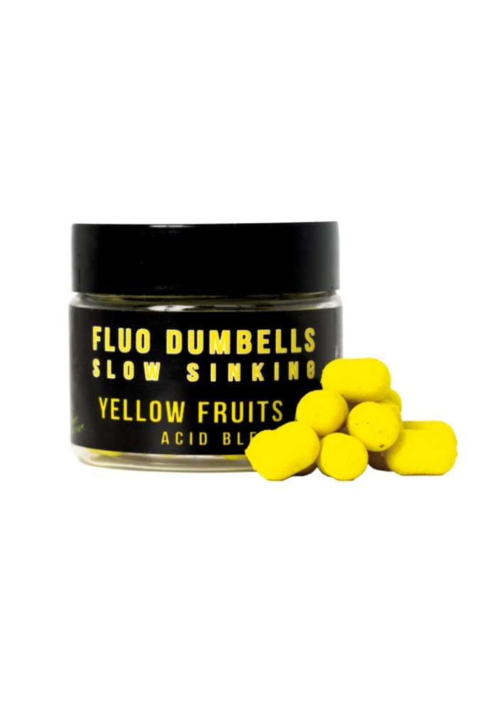 Dumbel bilanciati fluo. Yellow fruits acid blend è l’ esca da ricerca per eccellenza! Se cercate un esca molto acida che lavori bene in ogni ambiente, che sia particolarmente veloce nell’ entrare in pesca ed in grado di convincere a mangiare anche la carpa più apatica, la yellow è la scelta giusta! Si tratta di un’ esca “Winter/rapid” ovvero studiata per dare il massimo nel periodo freddo cosi come nelle pescate veloci e nelle competizioni, dove si rende necessario tirare fuori il massimo dell’ attrazione in poco tempo. Incredibilmente efficace in inverno, grazie alla sua struttura molto assorbente data dall’ impiego esclusivo di farine di pesce solubili, LT, blood plasma e birdfood tecnici tra quali spicca il nostro Overwhite e Yellow hp24 . Contiene un alta percentuale di lieviti, farine precotte,predigerite e destrinizzate ma anche probiotici di ultima generazione per renderle estremamente digeribili. L’interazione istantanea con l’ elemento liquido è ulteriormente esasperata da una combinazione molecolare di solventi ed esteri rapidissimi nel veicolare gli aromi in acqua..