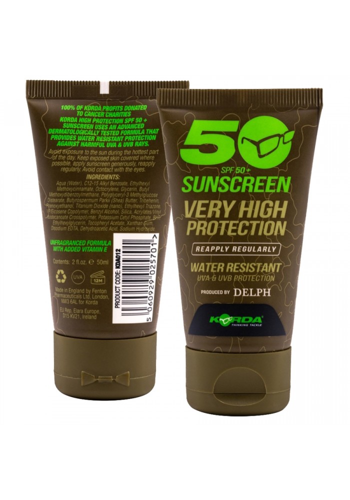 La protezione solare Korda factor 50+ ad alta protezione utilizza una formula avanzata dermatologicamente testata che fornisce una protezione resistente all'acqua contro i dannosi raggi UVA e UVB ed è fornita a NHS, MOD e RNLI per citarne alcuni. La formula non è profumata, arricchita con vitamina E ed è disponibile in un pratico sacchetto per attrezzi da 50 ml.