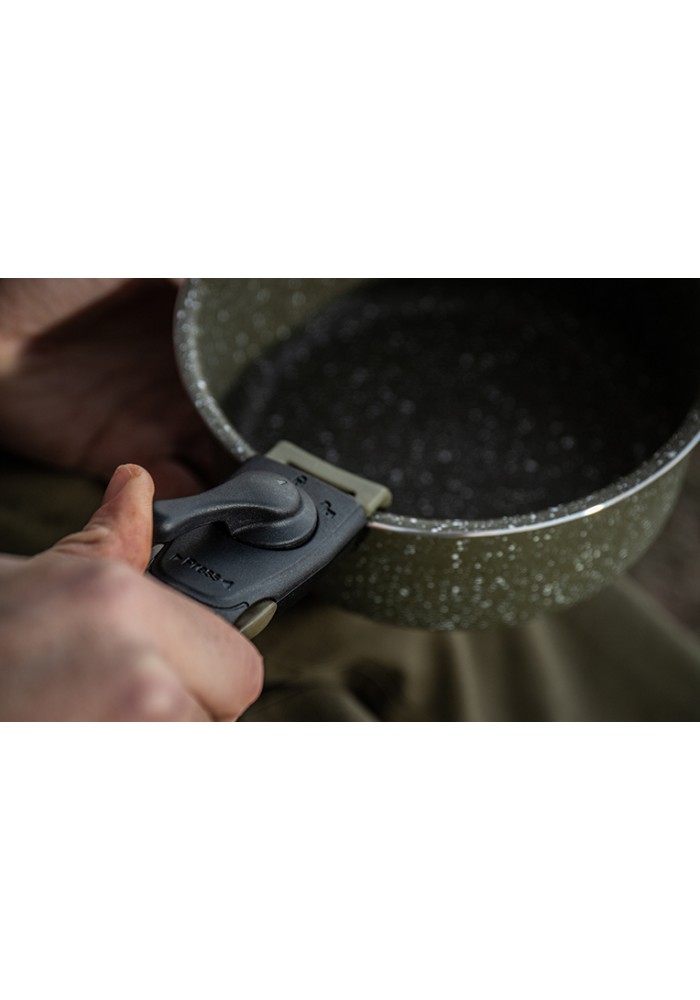 Ogni set comprende un pentolino fondo, una padella e un manico removibile, compatibile con tutte le pentole del range, con un sistema a doppia-azione per trattenere in sicurezza le pentole e prevenire qualsiasi chance di rilascio accidentale quando si maneggiano pentole calde.