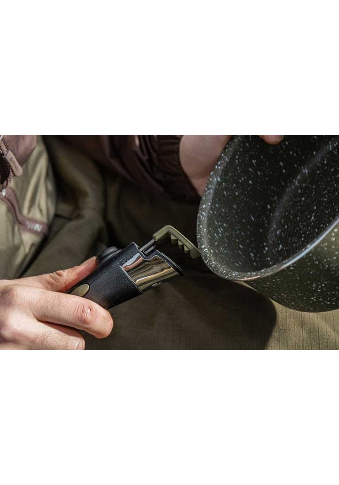 Sono progettate per essere usate con una varietà di fonti di calore sia a casa che a pesca, e sono rifinite in colore verde oliva con puntinature bianche e nere.