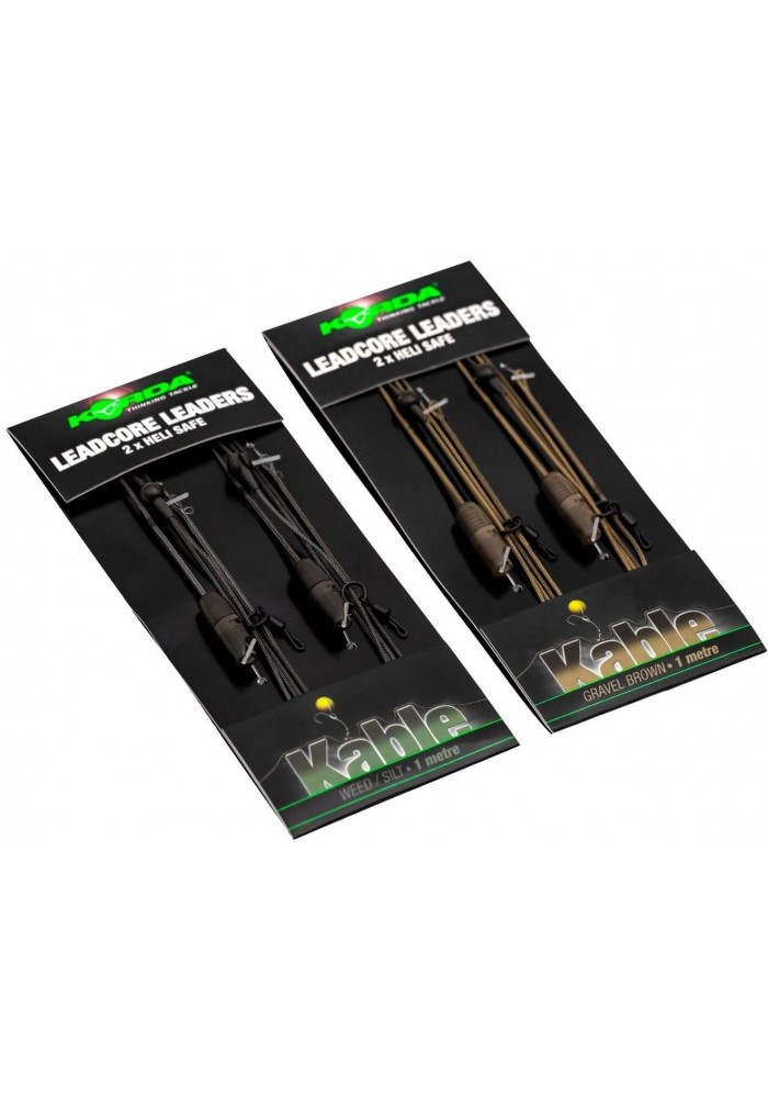 I leader Kable Heli-Safe Leadcore sono disponibili in una scelta di Gravel Brown o Weed/Limo, con due per confezione, e sono inoltre dotati di: 2 x perline No-Trace di ricambio; 2 collari Mini Heli-Safe; 2 molle rosse Mini Heli-Safe.