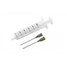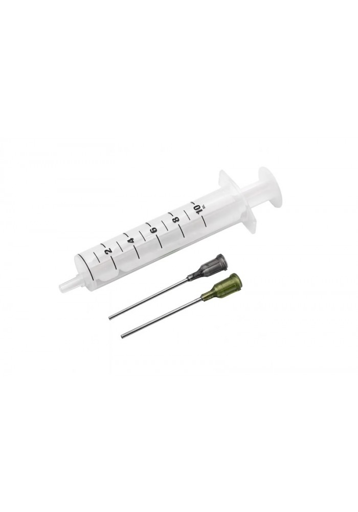 La siringa ha una capacità di 10 ml, con una scala graduata di 1 ml stampata sul corpo, che consente un dosaggio preciso. Il set include due punte di diverse dimensioni: una con foro sottile e una con foro grande.