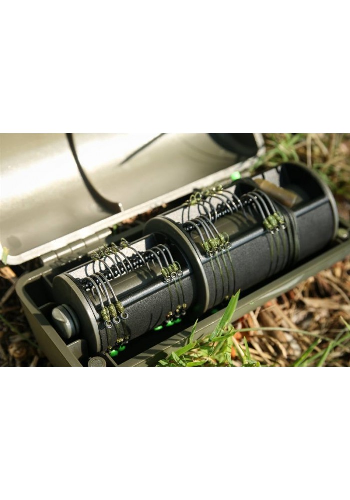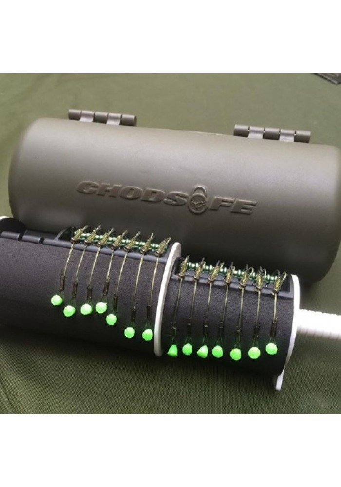 Se usate i Chod rigs, o gli Hinged stiff rigs, allora vorrete avere uno di questi cofanetti per tenere tutto in ordine. I cofanetti sono uno strumento a prova d’urto per curvare, e conservare nella loro perfetta curvatura, fino a 28 sezioni di ami Mouth Trap, di varie lunghezze. Due sezioni di diametro diverso vi permettono di preparare e conservare chod rig pretagliati, sia corti che più lunghi, nella loro perfetta curva di pesca. Inoltre, c’è spazio anche per tre Leadcore leader pretagliati (o simili) con le perline Heli-Safe attaccate. I nostri progettisti hanno creato un manico a scomparsa che vi permette di curvare i vostri chod sul vapore, in modo perfetto e senza bruciarvi le dita! Il cofanetto ChodSafe è rivestito di una gomma soffice al tocco ed offre un preciso sistema di chiusura magnetica che previene la sua apertura durante gli spostamenti. Ogni cofanetto ChodSafe contiene trenta puntine per fissare i vostri rig al rivestimento in gommapiuma delle sezioni cilindriche