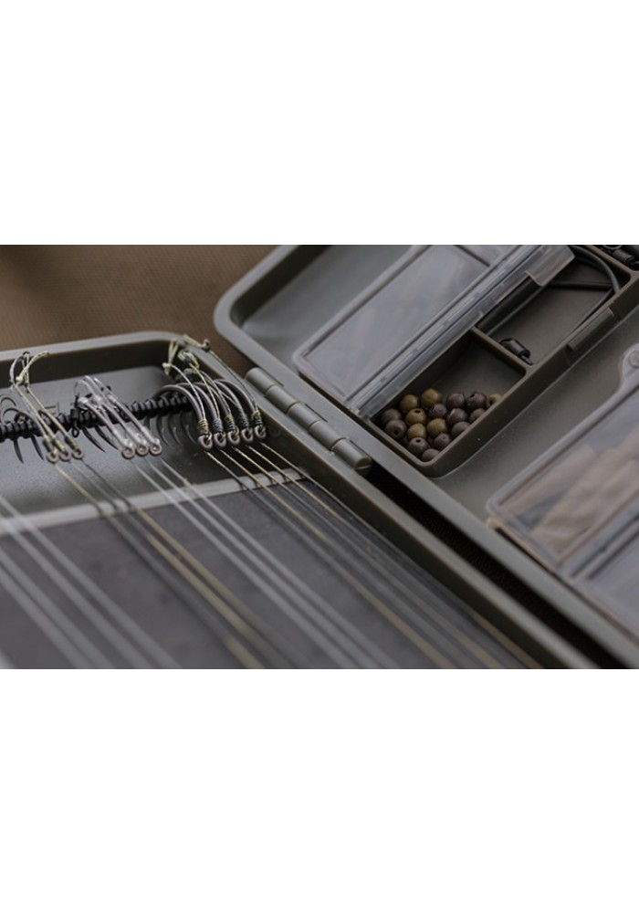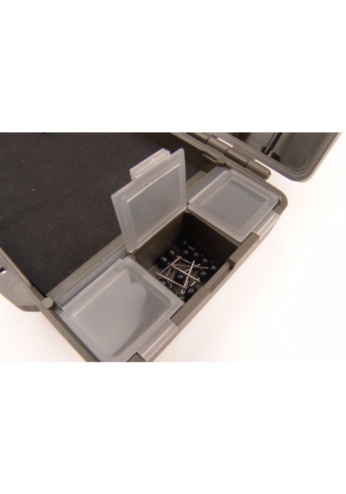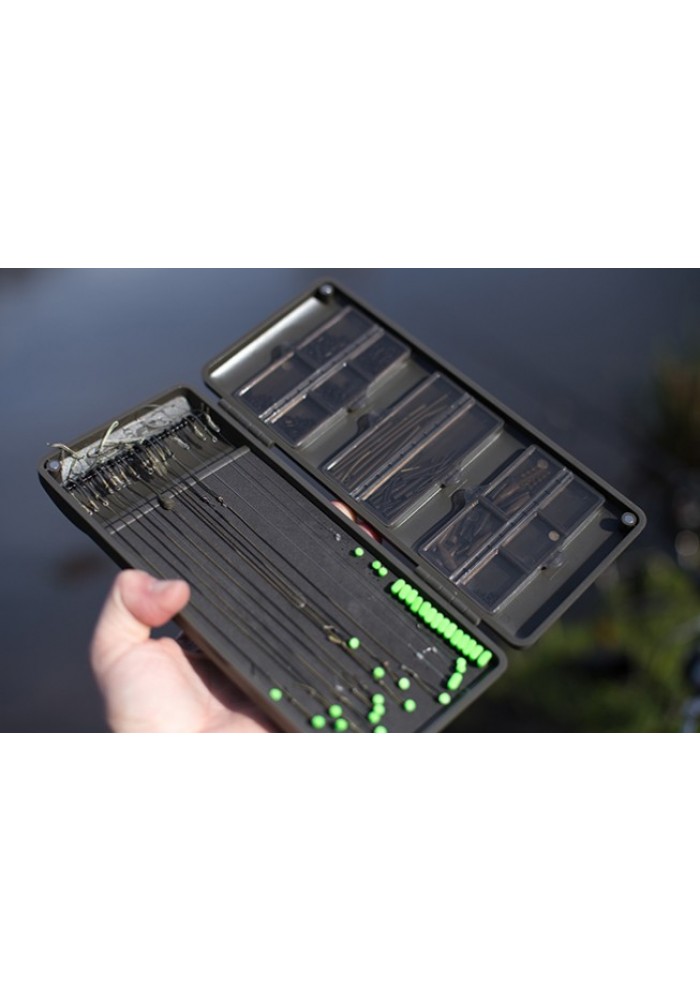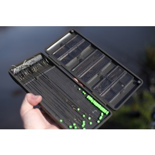 La scatola Portaterminali Mini Rig Safe Combi di Korda è un pratico box porta terminali che può contenere nella più totale sicurezza fino a 20 rigs di una lunghezza non superiore ai 20 cm. Dal design forte e compatto, la scatola Mini Rig Safe di Korda è fornita di 15 puntine e 10 "puntine doppie" ideati appositamente per agganciare i rigs senza il bisogno di un anello o di un perno. La chiusura magnetica della scatola Mini Rig Safe è progettata per consentirne un uso più semplice anche al freddo o al bagnato. A differenza della scatola Mini Rig Safe, questo nuovo modello di Korda presenta, sulla parte destra, dei microcontenitori per la minuteria. Il portaterminali diventa in pratica una mini-scatola da pesca.