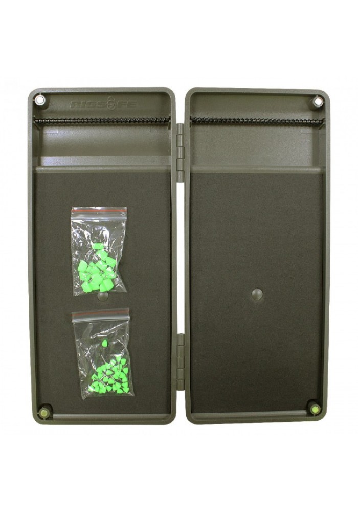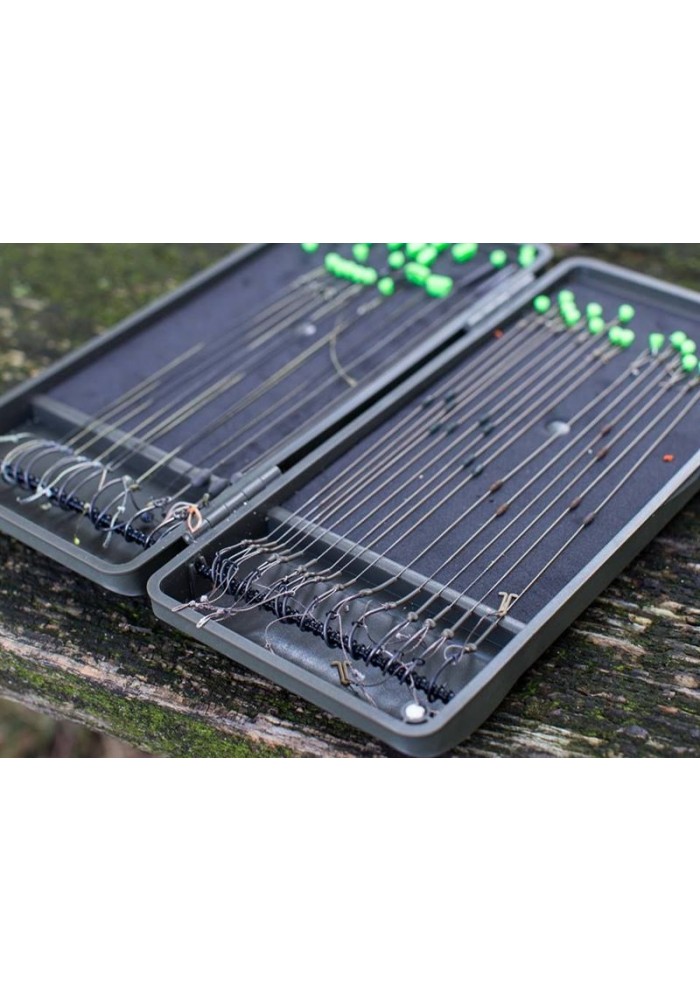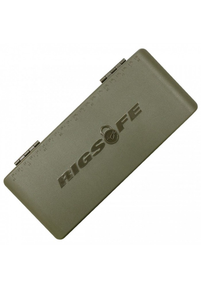 Il sistema di chiusura magnetico assicura che la casetta non possa venire aperta accidentalmente durante il trasporto rimanendo pur semplice da aprire anche in condizioni di bagnato o freddo come un inverno inglese! L’aggancio dei terminali è garantito da una barra di alluminio increspata che evita grovigli mentre sotto di essa, la scatola è leggermente incassata per proteggere le punte dei vostri ami. Il RigSafe è dotato di 30 pin singoli standard e 15 perni doppi che sono stati progettati per garantire il fissaggio dei terminali che non sono ancora stati finiti ( con un cappio o con una girella ) consentendo così di lasciare le regolazioni finali della lunghezza del rig fino a quando non si è sulla postazione di pesca.