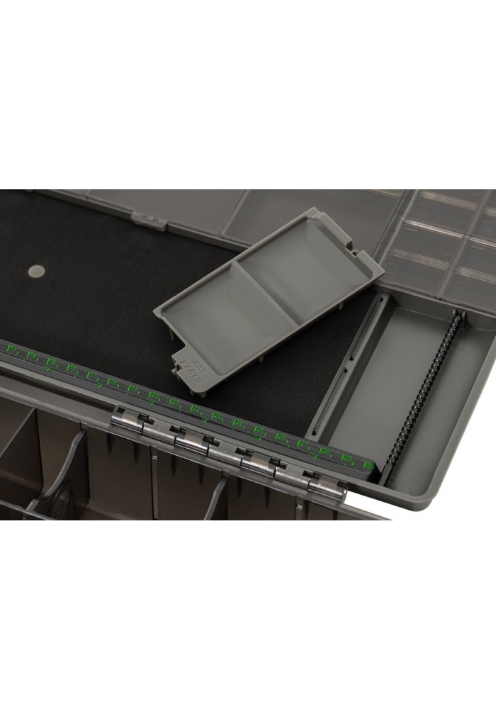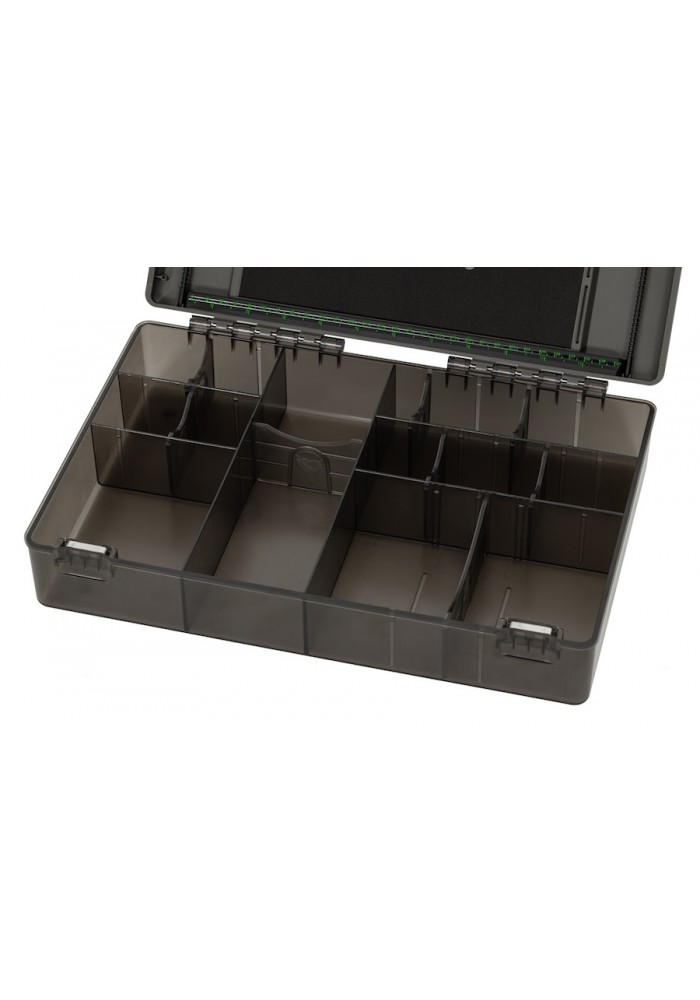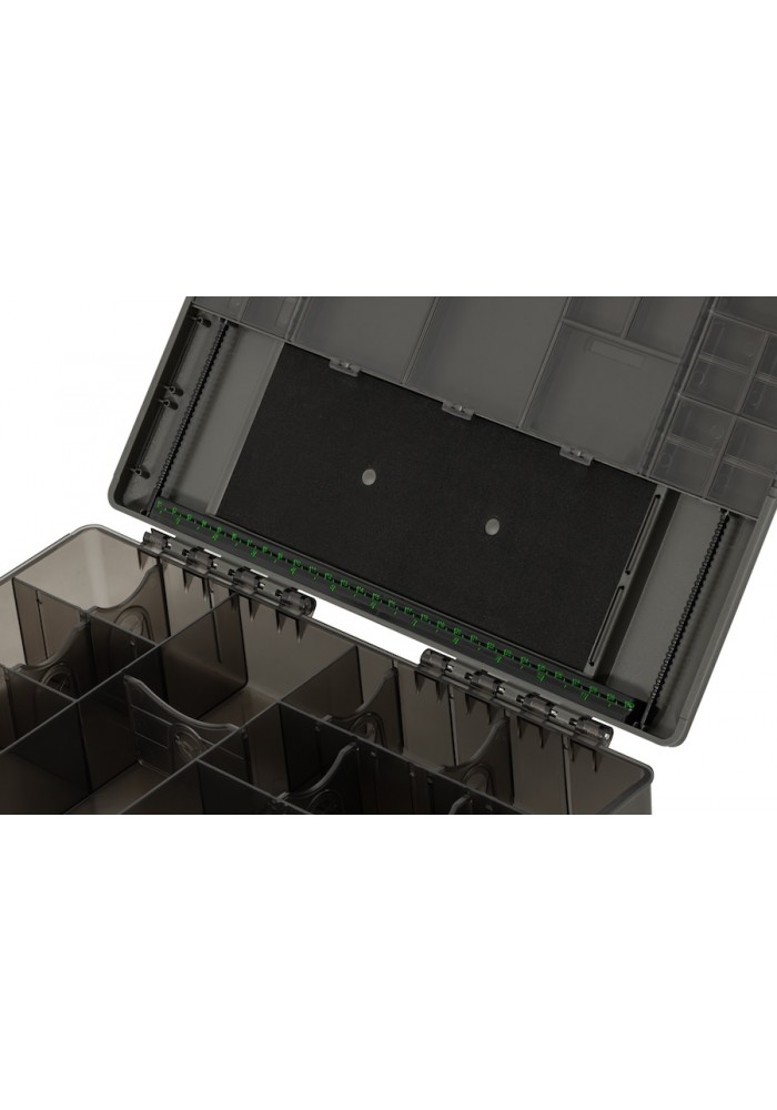 Le pareti permanenti all'interno della Tackle Box sono perfettamente distanziate per ospitare i nostri Hooklink Spools, Accessory Boxes, Bait Floss, Leadcore, Arma Kord, Leader Safes e Kamakura Hook Boxes, insieme ad altri articoli come forbici e aghi da innesco.
