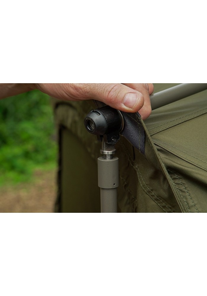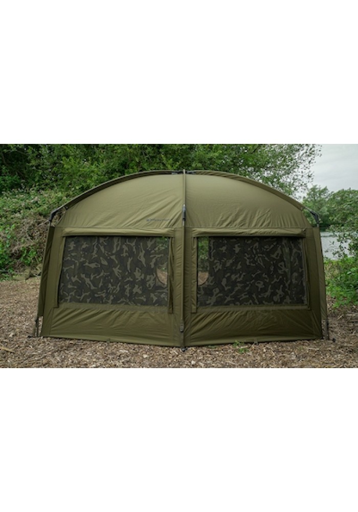 Quattro finestre in rete con colorazione Camo consentono il libero ricircolo di aria e l’accesso interno alle finestre principali del bivvy in rete.