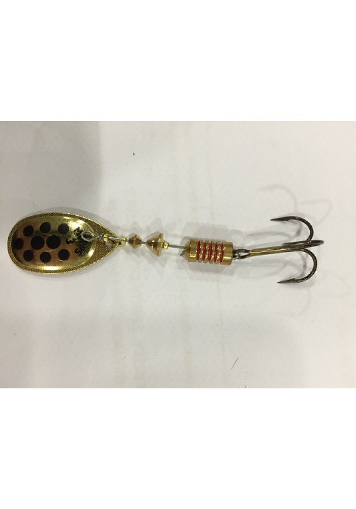 Artificiale rotante con paletta d'orata e punti neri conosciuto dai pescatori di tutto il mondo; ideale per tutti i tipi di pesca grazie alla vasta gamma di misure disponibile. Ottimo sulla distanza di lancio; lavora bene sia con recuperi lenti che veloci, ottimo l'effetto visivo e acustico durante il moto. Disponibile nelle misure: