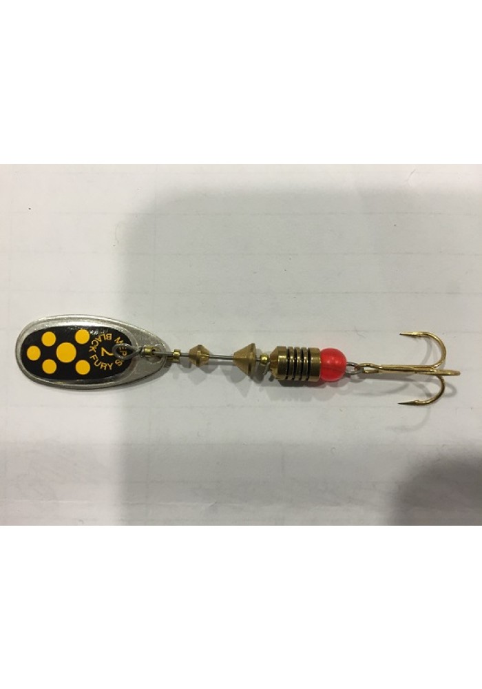 Artificiale rotante paletta argentata e nera e punti gialli, conosciuto dai pescatori di tutto il mondo; ideale per tutti i tipi di pesca grazie alla vasta gamma di misure disponibile. Ottimo sulla distanza di lancio; lavora bene sia con recuperi lenti che veloci, ottimo l'effetto visivo e acustico durante il moto. Disponibile nelle misure: