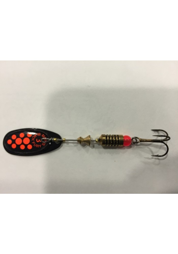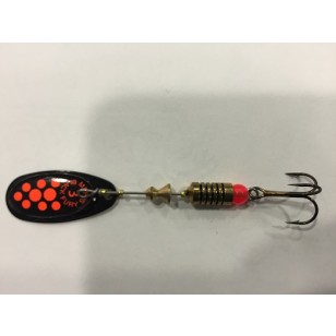 Artificiale rotante paletta nera e punti rossi, conosciuto dai pescatori di tutto il mondo; ideale per tutti i tipi di pesca grazie alla vasta gamma di misure disponibile. Ottimo sulla distanza di lancio; lavora bene sia con recuperi lenti che veloci, ottimo l'effetto visivo e acustico durante il moto. Disponibile nelle misure:
